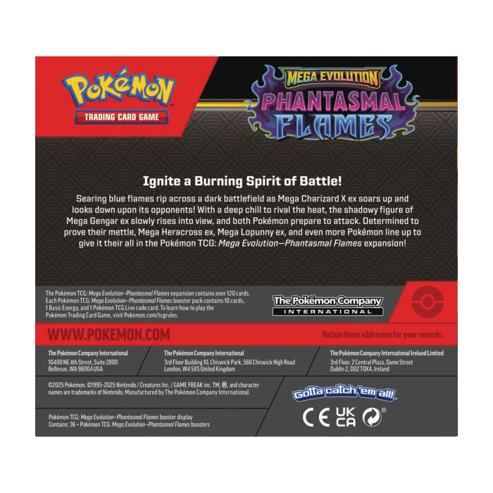 Searing blue flames rip across a dark battlefield as Mega Charizard X ex soars up and looks down upon its opponents! With a deep chill to rival the heat, the shadowy figure of Mega Gengar ex slowly rises into view, and both Pokémon prepare to attack. Determined to prove their mettle, Mega Heracross ex, Mega Lopunny ex, and even more Pokémon line up to give it their all in the Pokémon TCG: Mega Evolution— Phantasmal Flames expansion!